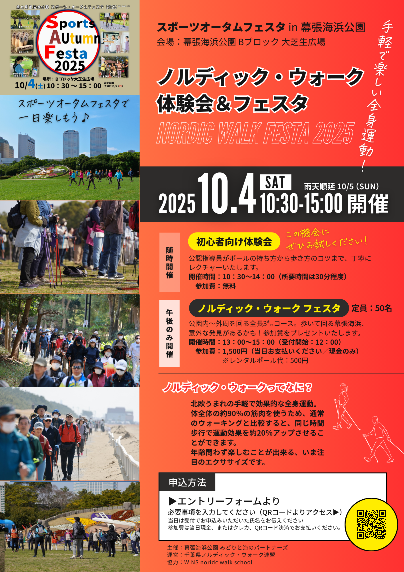 「スポーツ オータム フェスタ2025」は幕張海浜公園みどりと海のパートナーズが主催となりますがこのイベント「幕張海浜公園ノルディック・ウォークフェスタは千葉県ノルディック・ウォーク連盟が運営(協力:WINS nordic walk school)を行うことからお申し込み情報は千葉県ノルディック・ウォーク連盟に共有させていただきます。